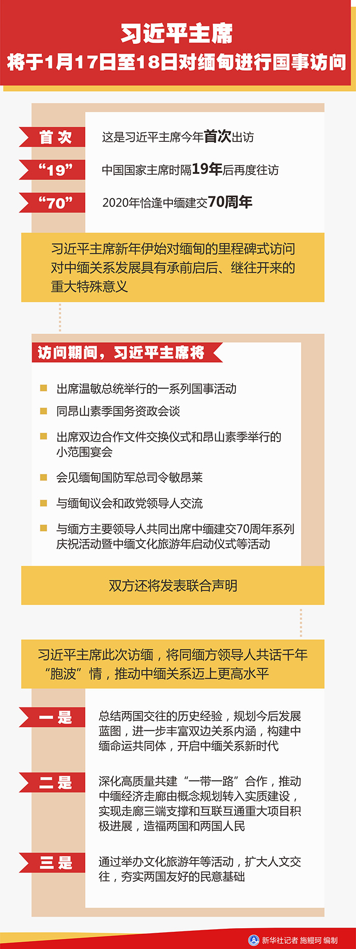 羅照輝表示,習近平主席此次訪緬,將同緬方領導人共話千年“胞波”情,同譜合作新華章,提升政治關系定位,深化互聯互通合作,推進中緬經濟走廊建設,推動中緬關系邁上更高水平。一是總結兩國交往的歷史經驗,規劃今后發展藍圖,進一步豐富雙邊關系內涵,構建中緬命運共同體,開啟中緬關系新時代。二是深化高質量共建“一帶一路”合作,推動中緬經濟走廊由概念規劃轉入實質建設,實現走廊三端支撐和互聯互通重大項目積極進展,造福兩國和兩國人民。三是通過舉辦文化旅游年等活動,擴大人文交往,夯實兩國友好的民意基礎。相信在雙方共同努力下,習近平主席新年伊始對緬甸的里程碑式訪問必將取得圓滿成功,在中緬友好交往史上留下濃墨重彩的一筆。