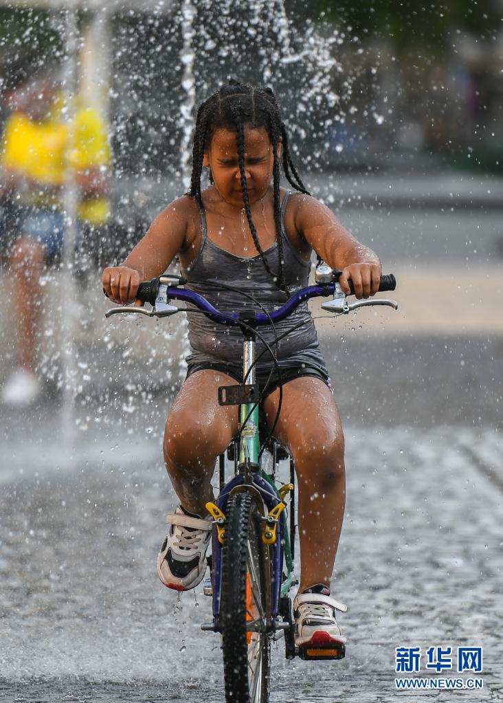 6月17日,在德國(guó)法蘭克福,一名小朋友騎車穿過噴泉納涼。