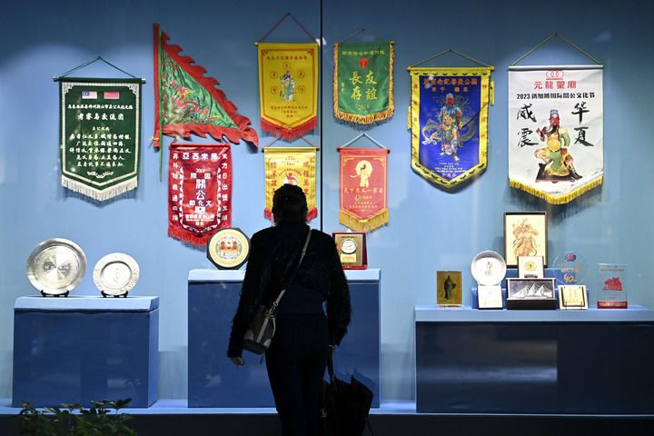 在解州关帝庙内的“全球关公文化交流展”展厅中,陈列有来自泰国、越南、印度尼西亚、新加坡、马来西亚、日本等国家的几十件实物,包括旗帜、瓷器、绘画、纪念章等,前后跨度40余年,记录了全球各地在关公文化交流中的符号印记。