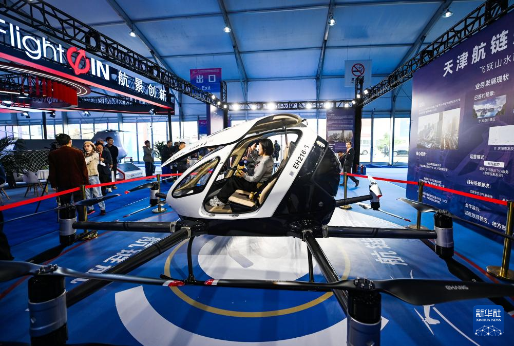 10月16日,观众在天津直博会低空经济馆内体验一款垂直起降(eVTOL)航空器。新华社记者 赵子硕 摄