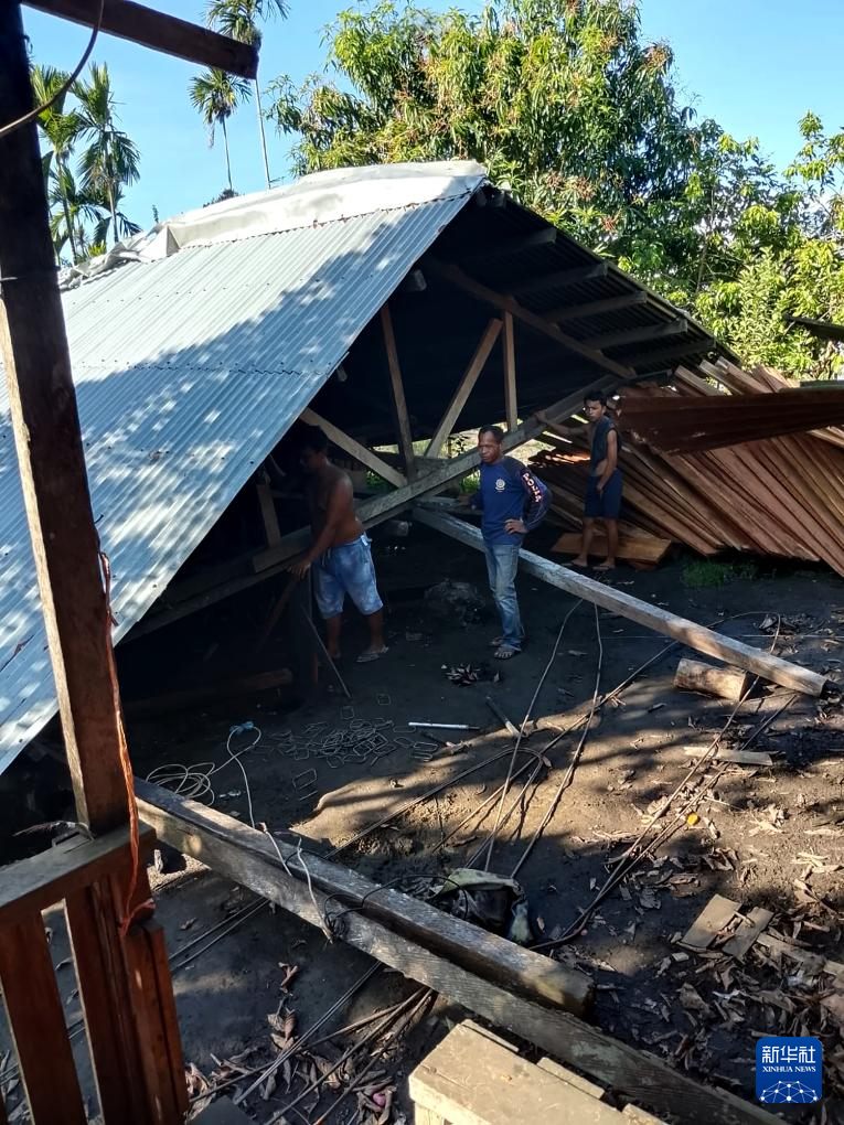 10月16日,在印度尼西亚巴布亚省萨米县,人们站在受损的房屋旁。新华社发(印尼国家抗灾署供图)