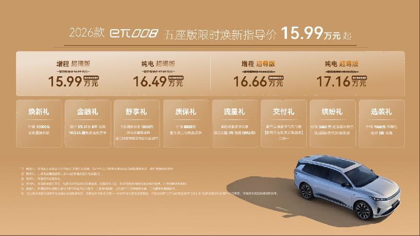 2026款eπ008五座版提供增程、纯电两种动力,超阔版、超尊版两种配置,共计四款产品,限时焕新指导价15.99-17.16万元,还可享受包含金融礼、质保礼、交付礼、选装礼、流量礼等多重上市权益。