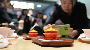 5月10日,在沈阳故宫,一名游客拍摄“大政殿慕斯蛋糕”。