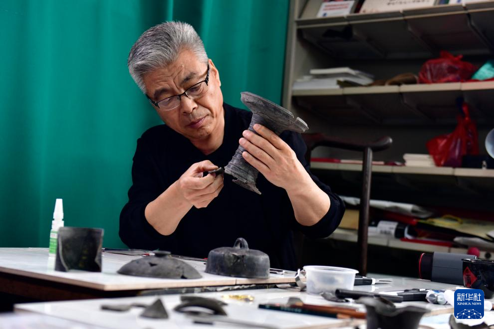 5月26日,在日照黑陶邢艺术厂,省级非遗传承人邢葆东在修复黑陶。