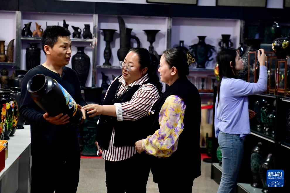 5月26日,在中国黑陶文化博物馆文创中心,顾客在选购黑陶产品。