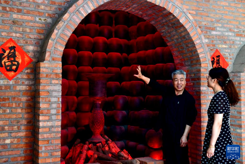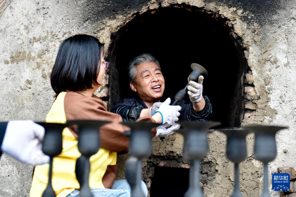 5月26日,在日照黑陶邢艺术厂,省级非遗传承人邢葆东(右)从窑中取出刚烧制的黑陶。