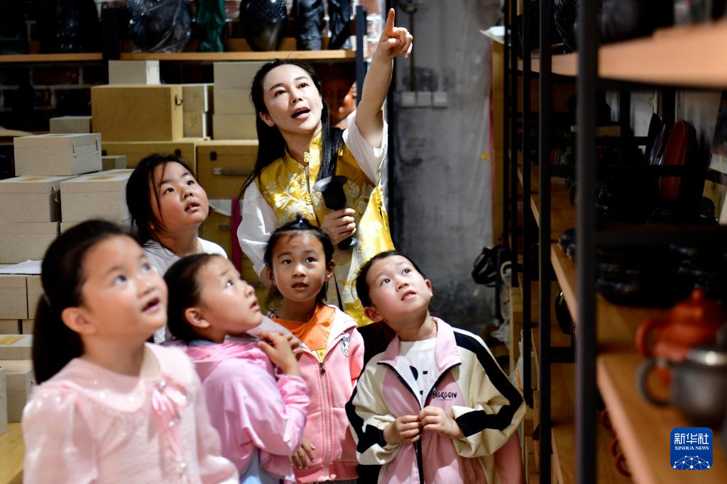 5月26日,在日照高新区慧敏非遗工作室,市级非遗传承人秦慧敏给孩子们介绍黑陶文化。