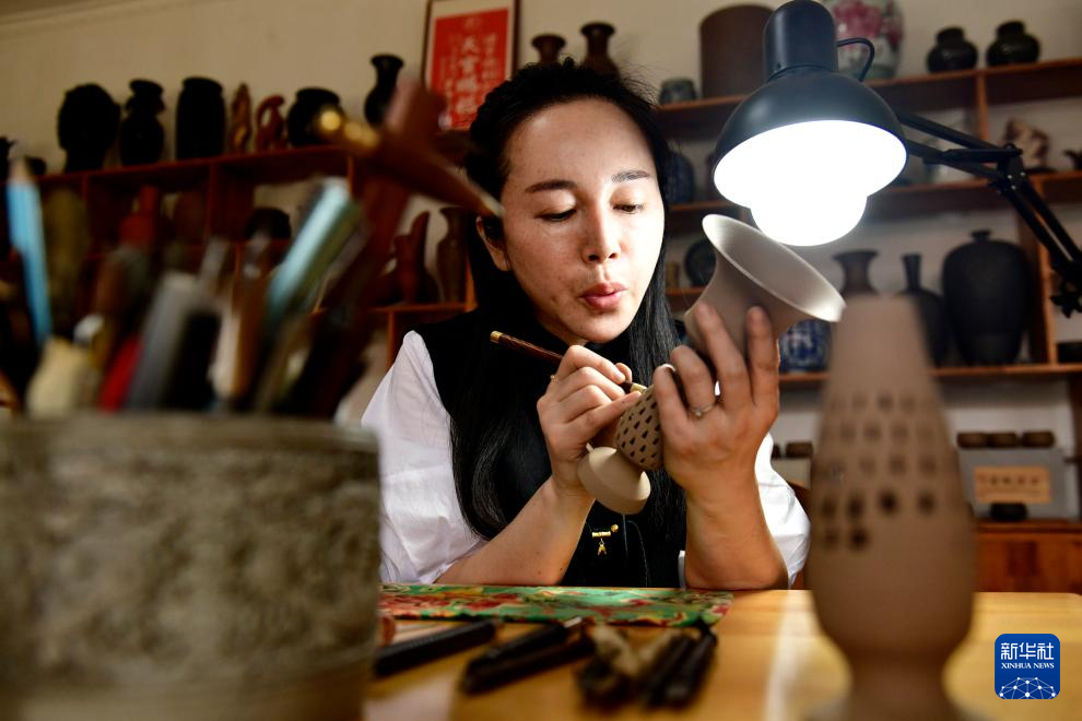 5月26日,在日照高新区慧敏非遗工作室,市级非遗传承人秦慧敏在制作蛋壳陶。