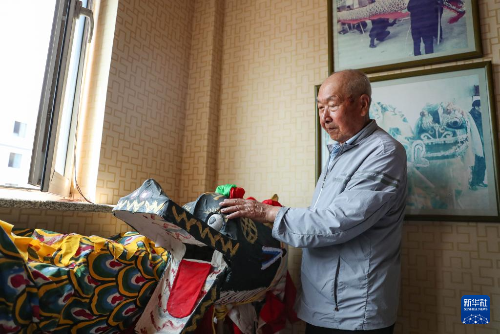 6月4日,张仲发在位于沈阳市沈北新区虎石台街道的非遗工作室中抚摸龙头。