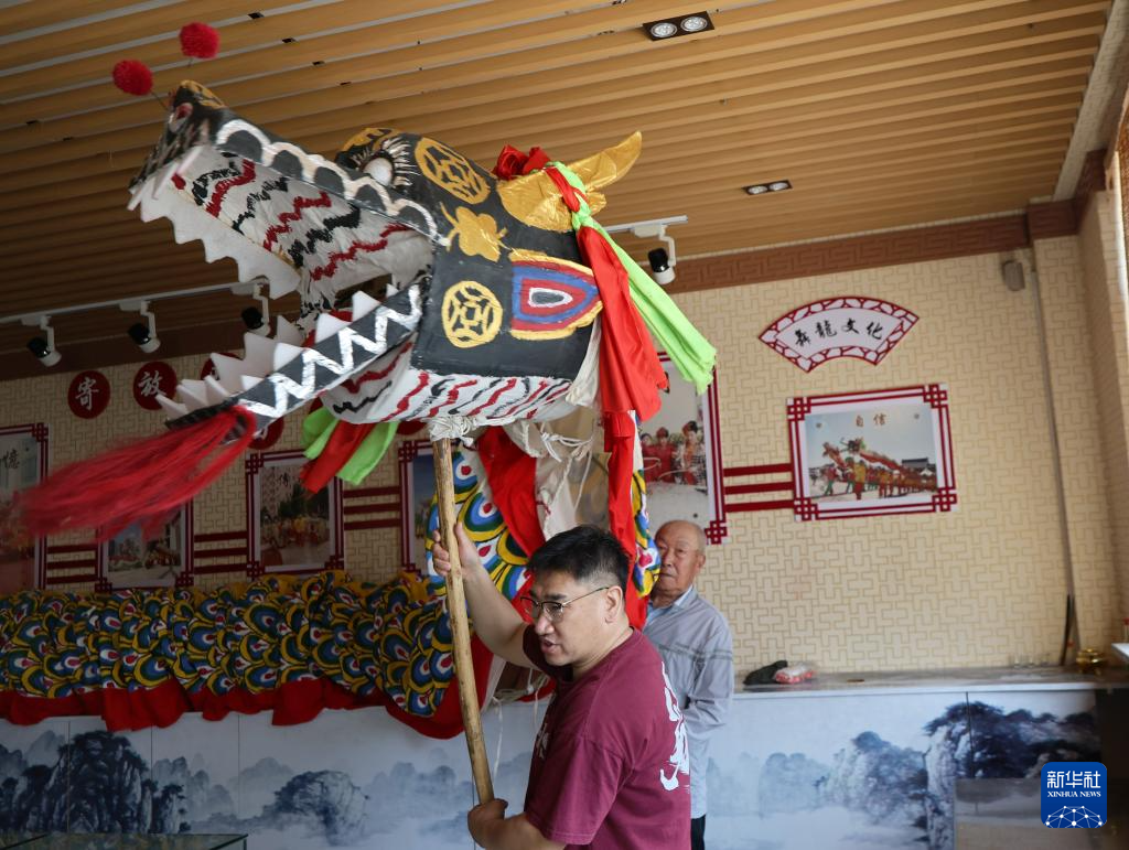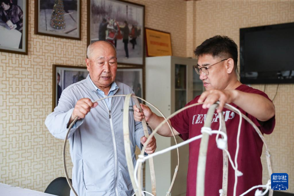 6月4日,张仲发的侄子张新吉(前)在位于沈阳市沈北新区虎石台街道的非遗工作室中学习舞龙头。