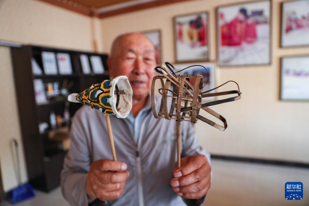 6月4日,张仲发在位于沈阳市沈北新区虎石台街道的非遗工作室中展示龙头和龙尾的微缩模型。