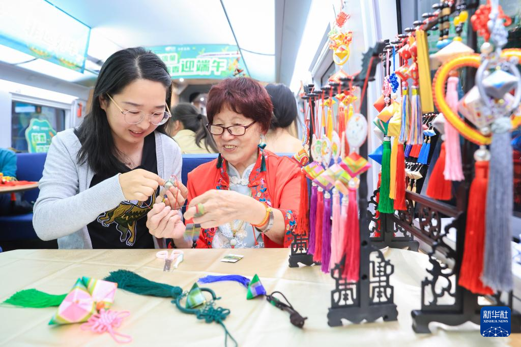 6月5日,在G7393次列车上,旅客(左)在民间艺人的指导下体验制作端午彩粽。