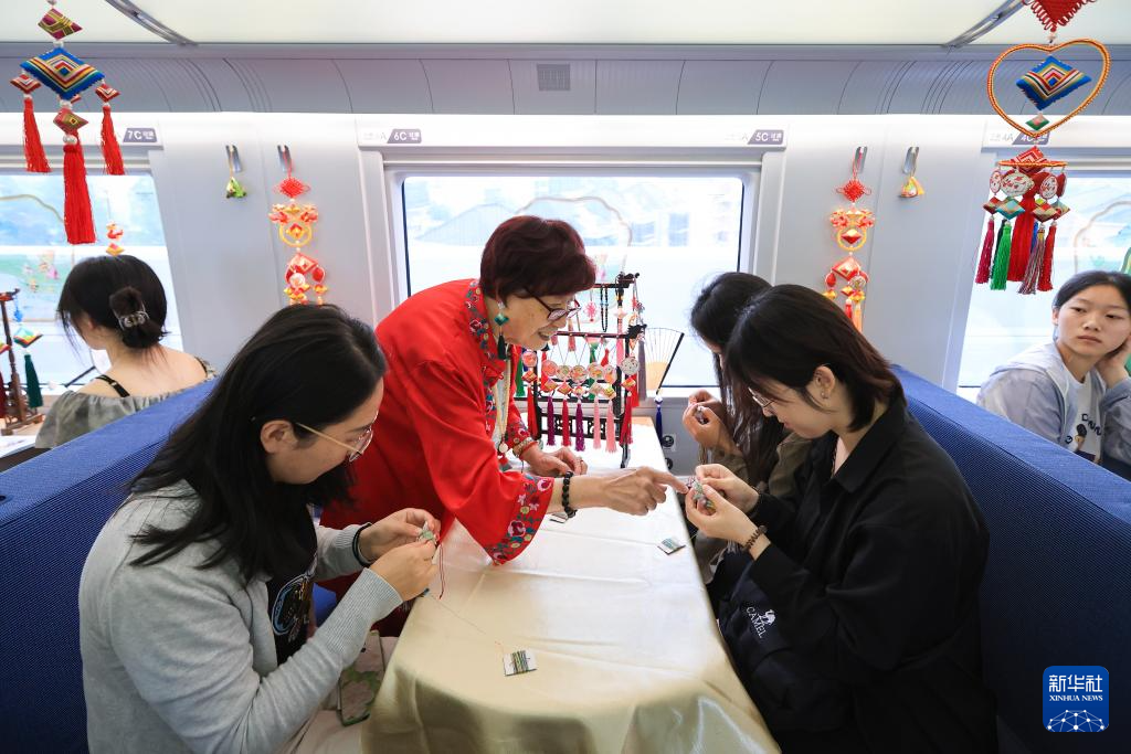 6月5日,在G7393次列车上,旅客在民间艺人的指导下体验制作端午彩粽。