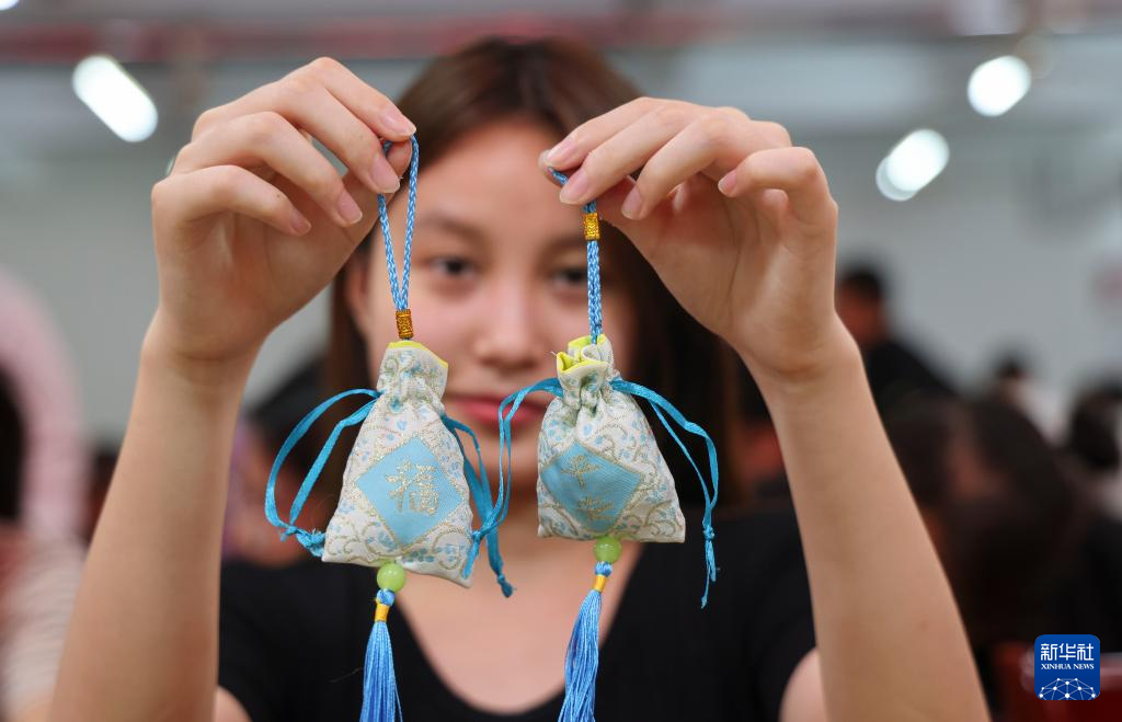 6月6日,在山东省临沂市兰山区银雀山街道,一名女士展示制作好的香囊。