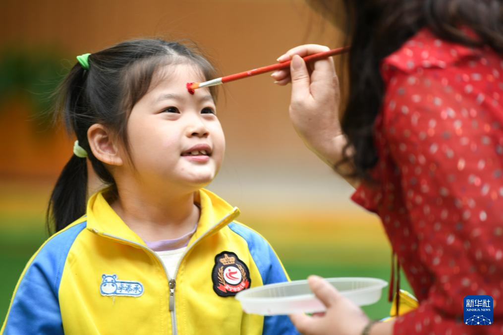 6月6日,湖南省常宁市幼儿园兰江园的老师在为小朋友点朱砂。