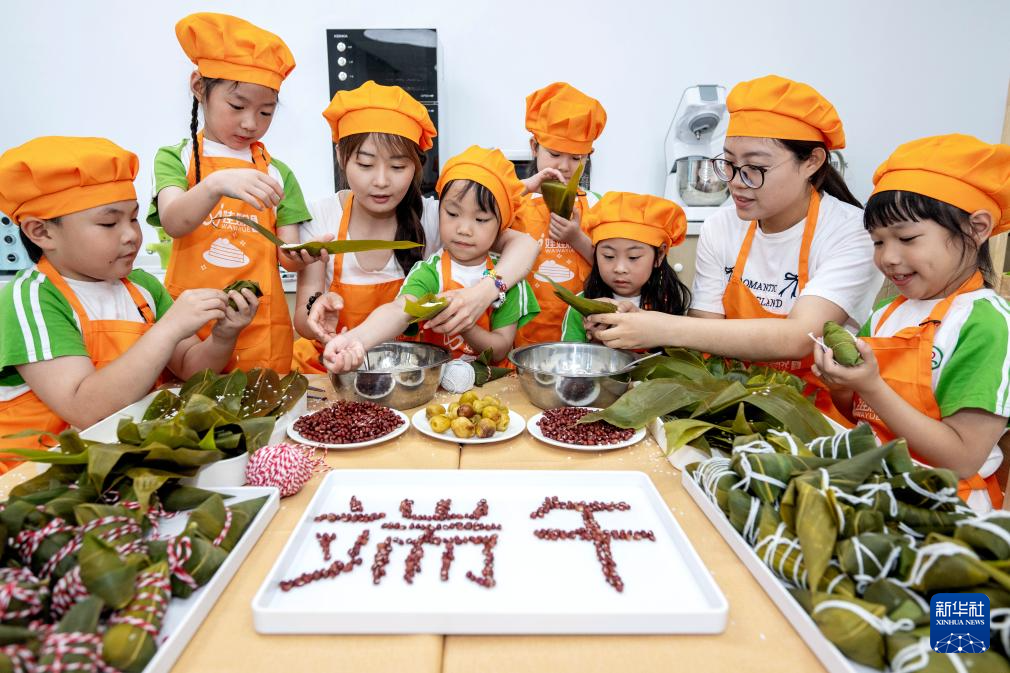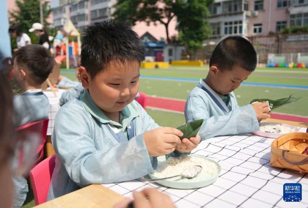 6月6日,在山东省潍坊市潍城区实验小学幼儿园,孩子们在体验包粽子。