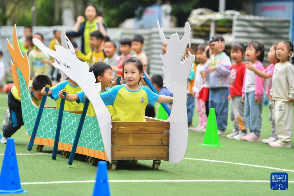 6月6日,在长沙市天心区教育局中建幼儿园“粽情欢畅 浓香端午”主题活动上,小朋友在“龙舟竞赛”中击鼓。