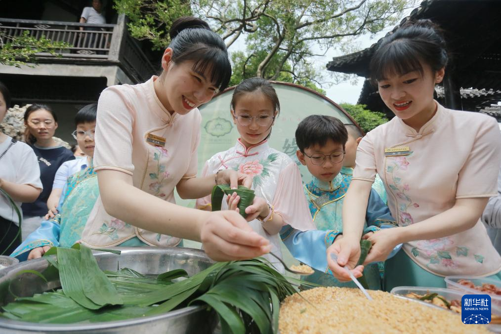 6月10日,在江苏省扬州市何园景区,小朋友们和工作人员一起包粽子。