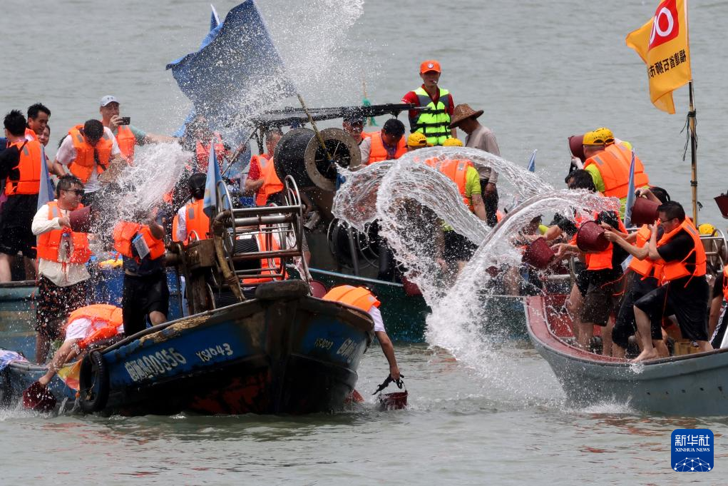 6月10日,第十八届闽台对渡文化节暨蚶江海上泼水节活动在福建省石狮市蚶江镇开幕。这是游客在文化节上体验海上泼水。