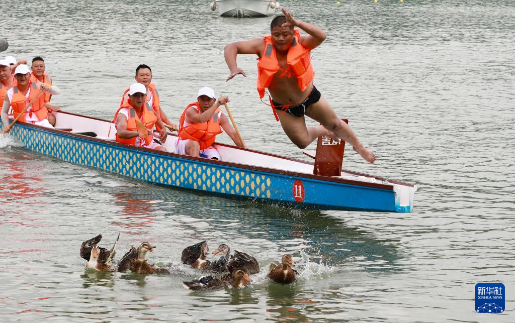 6月10日,四川省广安市武胜县龙舟队员参加趣味抢鸭活动。