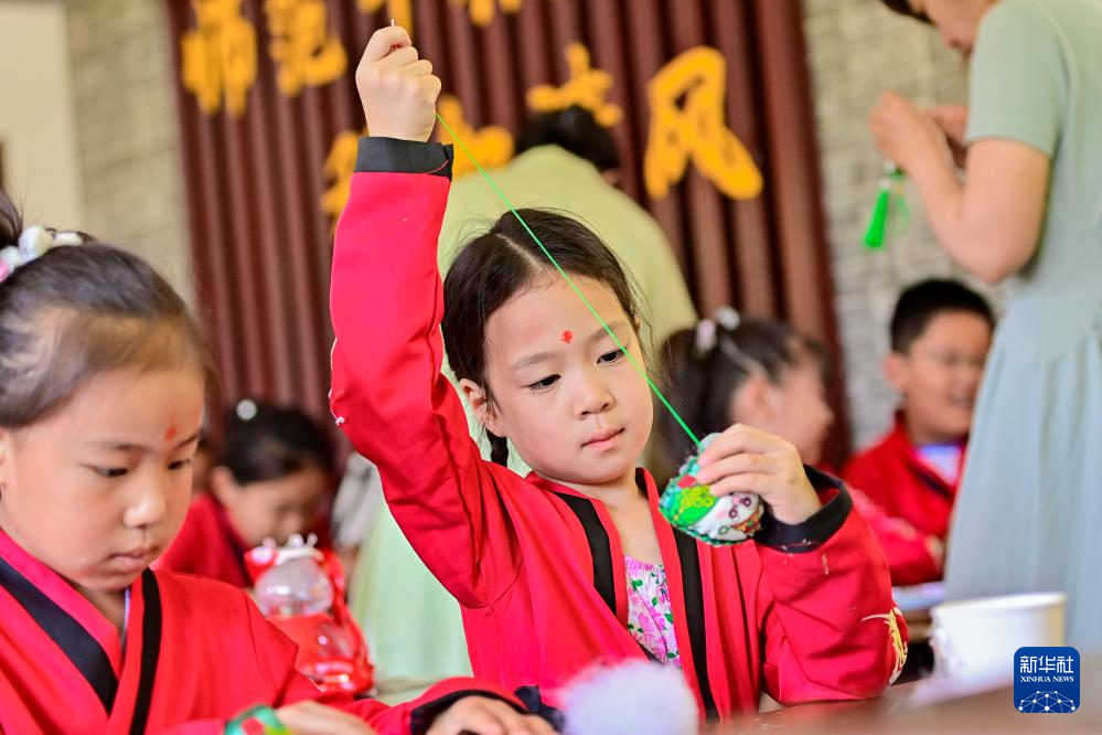 6月10日,小朋友在山东省青州市范公亭公园非遗传习讲堂开展的体验活动中缝制香囊。