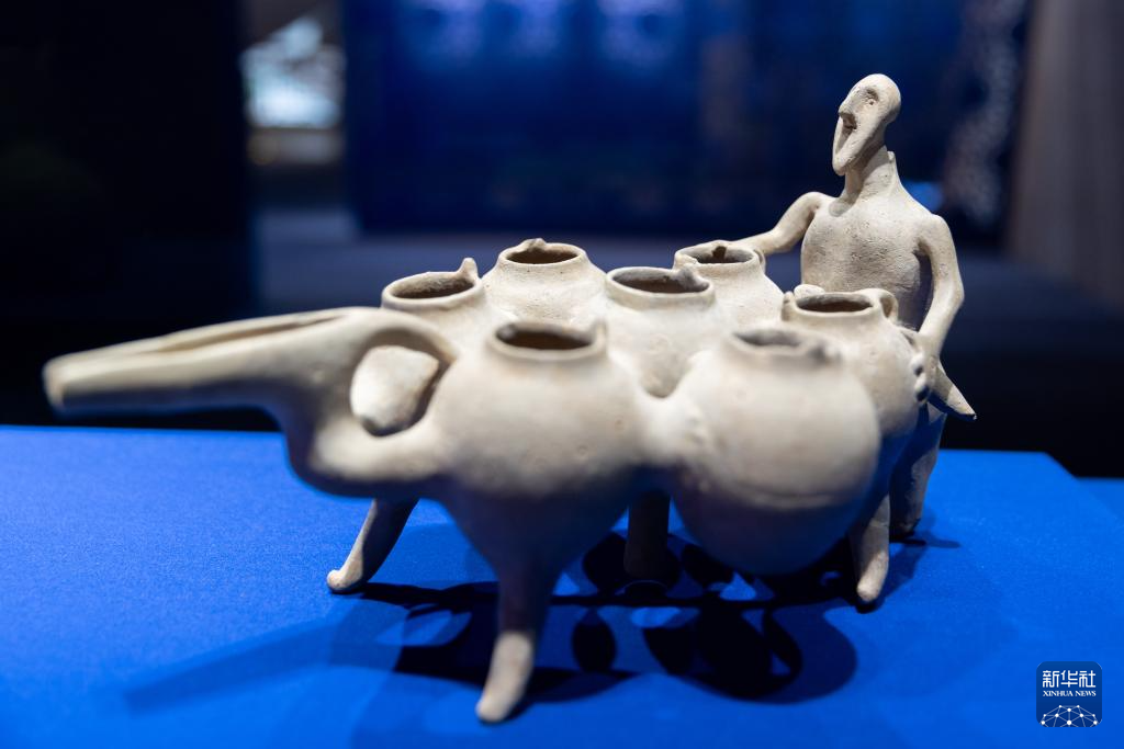 6月12日,在“古波斯的荣耀——伊朗文物精华展”上拍摄的“多罐人像陶来通”。