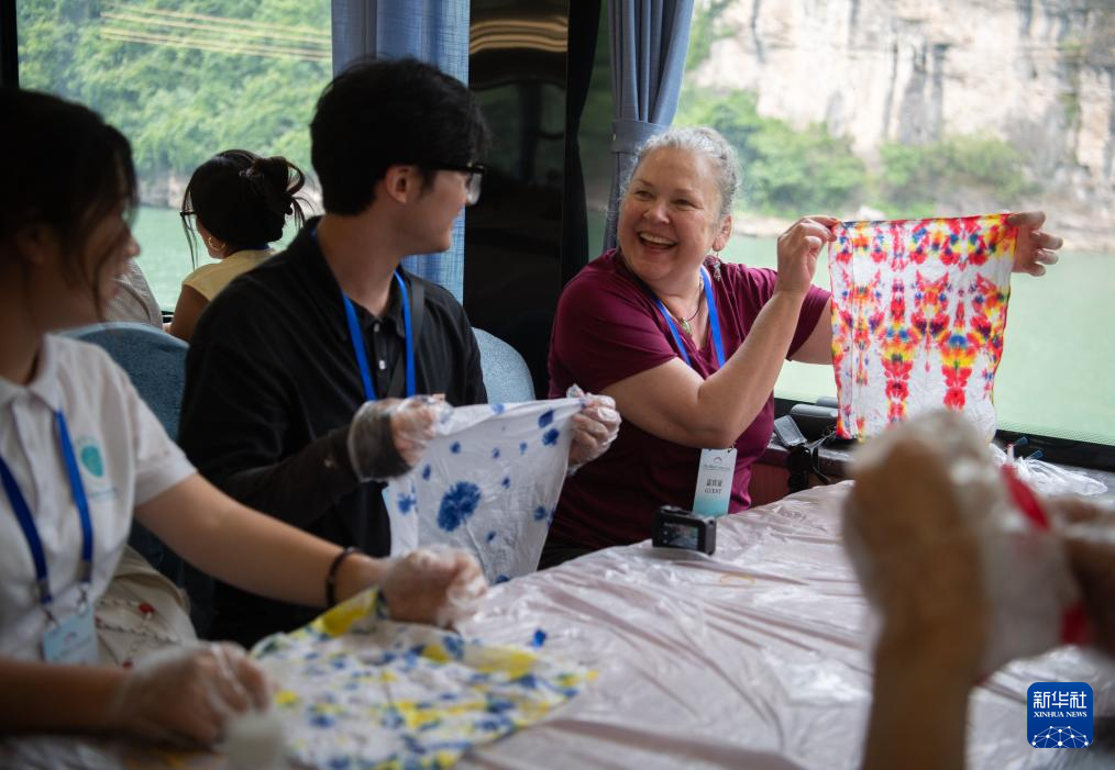 6月11日,在湖北省宜昌市,交流活动成员在纯电动旅游船“长江三峡1”号上体验扎染。