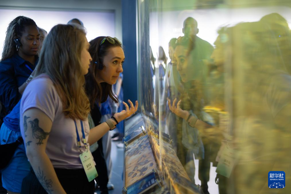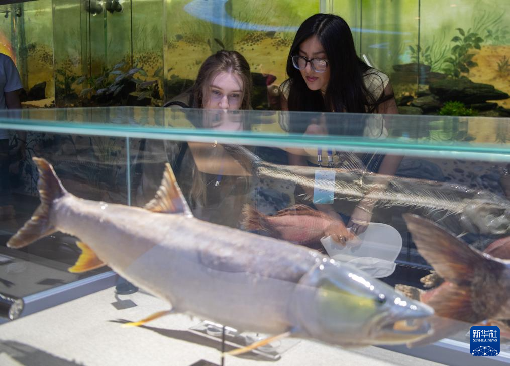 6月11日,在湖北省宜昌市,美国青年在三峡集团长江珍稀鱼类保育中心参观。