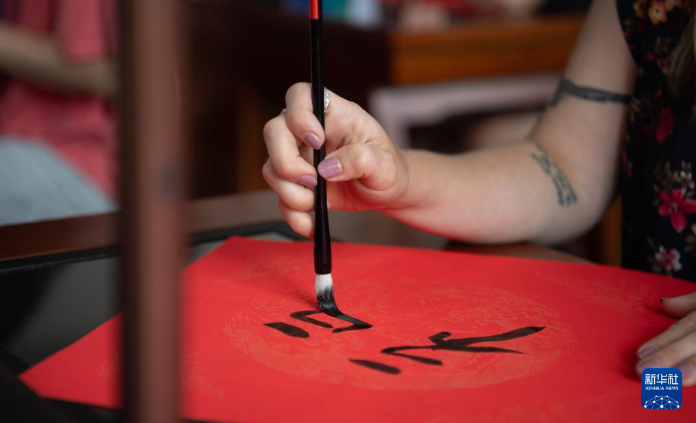 6月8日,在湖北第二师范学院,美国青年体验书法课。