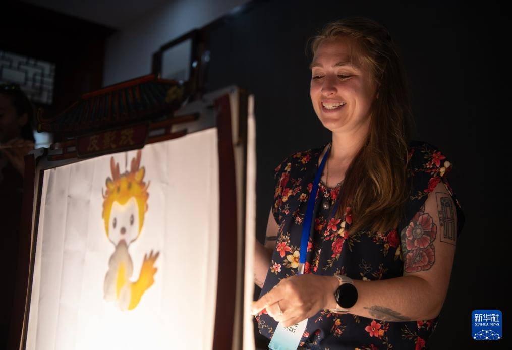 6月8日,在武汉音乐学院,交流活动成员体验皮影戏。