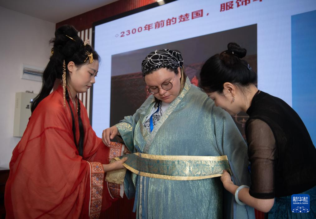 6月8日,在湖北第二师范学院,美国青年体验传统服饰。