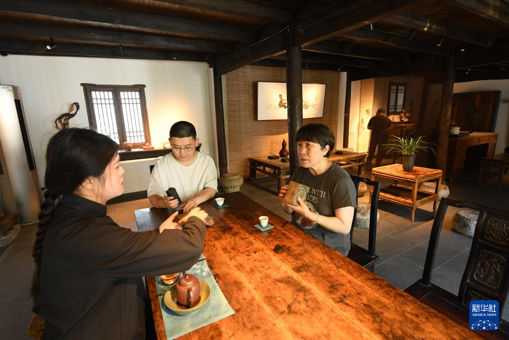 6月12日,在杭州小河直街历史文化街区,一个文化空间的主理人焦娇(左一)和朋友分享自己收藏的古砚。
