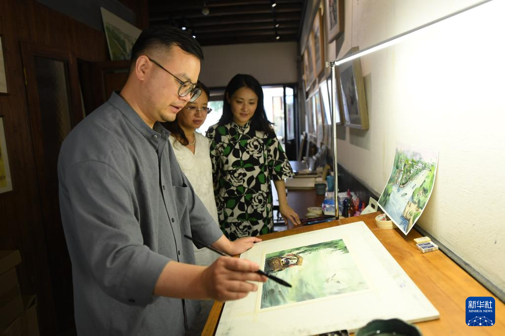 6月12日,杭州小河直街历史文化街区,青年画家张甜甜在工作室画运河主题的水彩画。