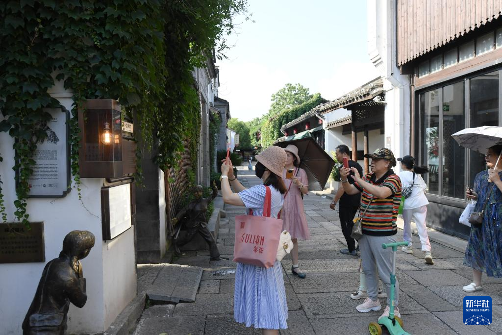 6月12日,游客在杭州小河直街历史文化街区留影。