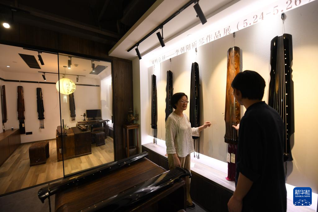6月12日,在杭州大兜路历史文化街区一家古琴馆,工作人员向客人介绍正在举办的古琴展。