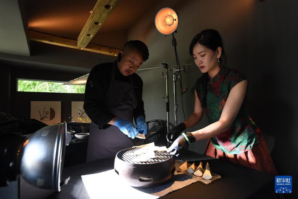 6月12日,在杭州大兜路历史文化街区的一家素食餐厅,主理人程译萱(右)和主厨在开发夏季时令菜品。
