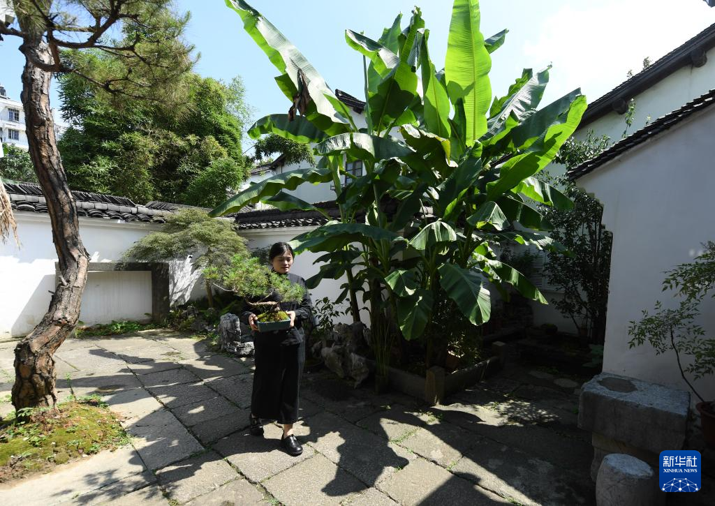 6月12日,在杭州小河直街历史文化街区,一个文化空间的主理人焦娇在打点庭院。