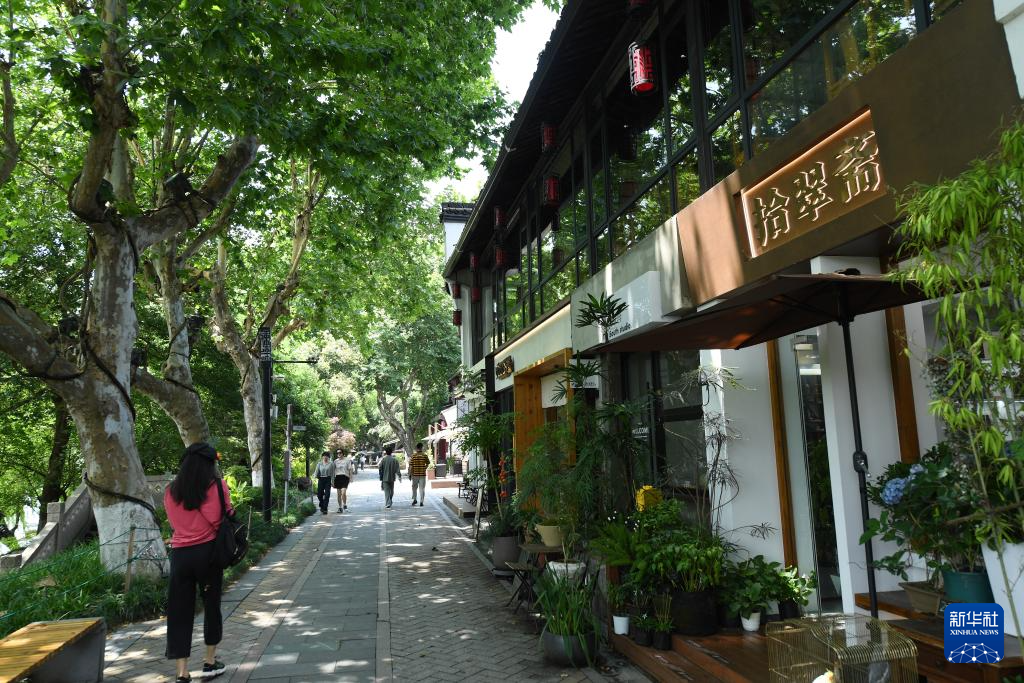 6月12日,人们在绿树成荫的杭州大兜路历史文化街区游览。