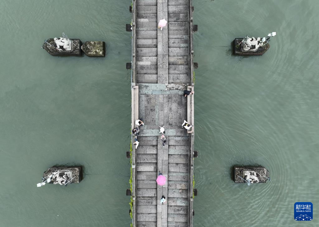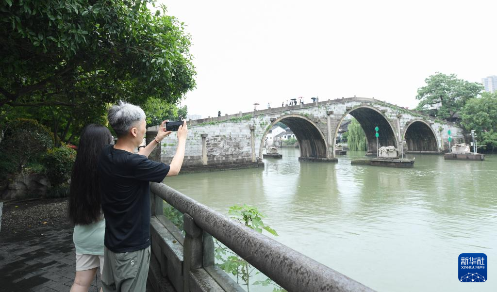 6月12日,游客在杭州小河直街历史文化街区一座石拱桥上游玩(无人机照片)。