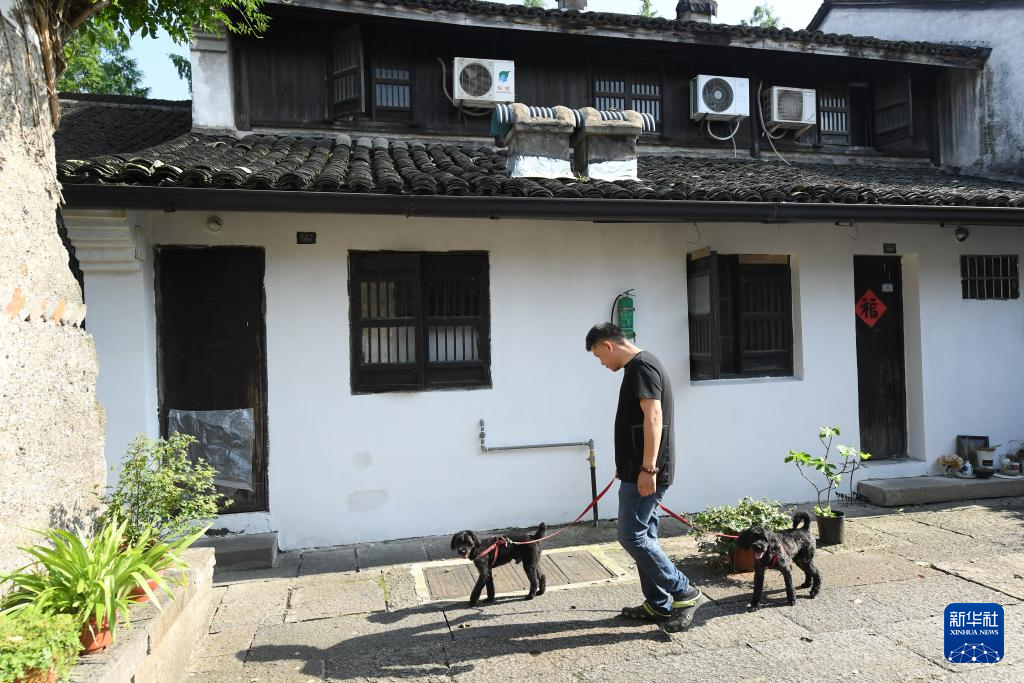 6月12日,一位居民在杭州桥西历史文化街区遛狗。