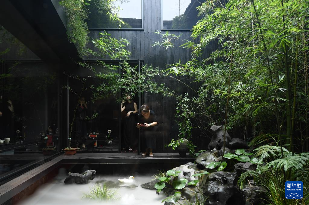 6月12日,在杭州大兜路历史文化街区的一家素食餐厅,客人拍摄庭院风景。