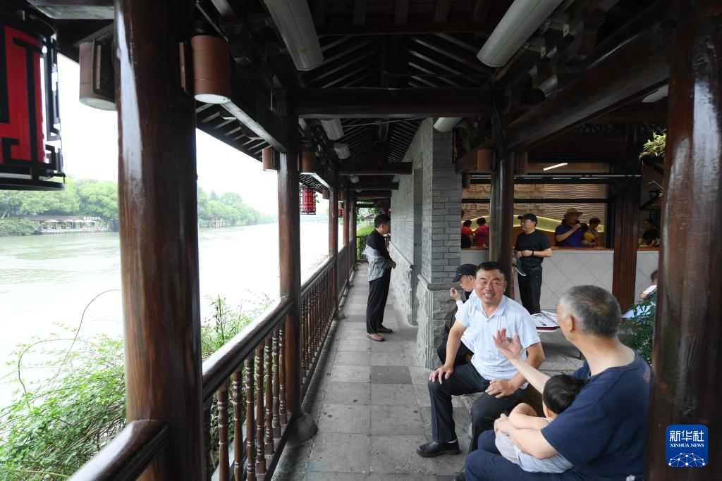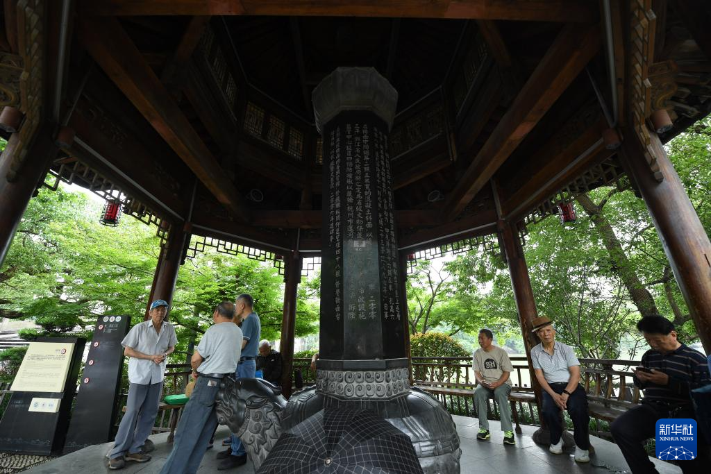 6月12日,人们在拱宸桥畔的碑亭里休憩。