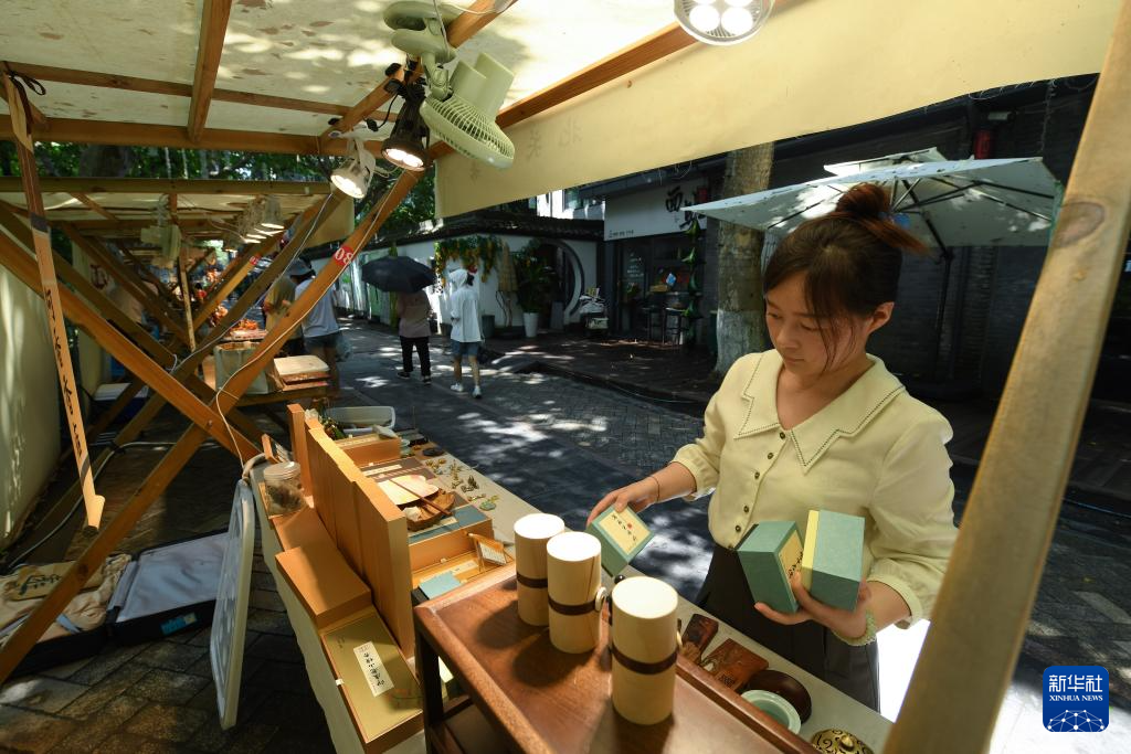 6月12日,在杭州大兜路历史文化街区,一名市集摊主摆放创意香道用品。