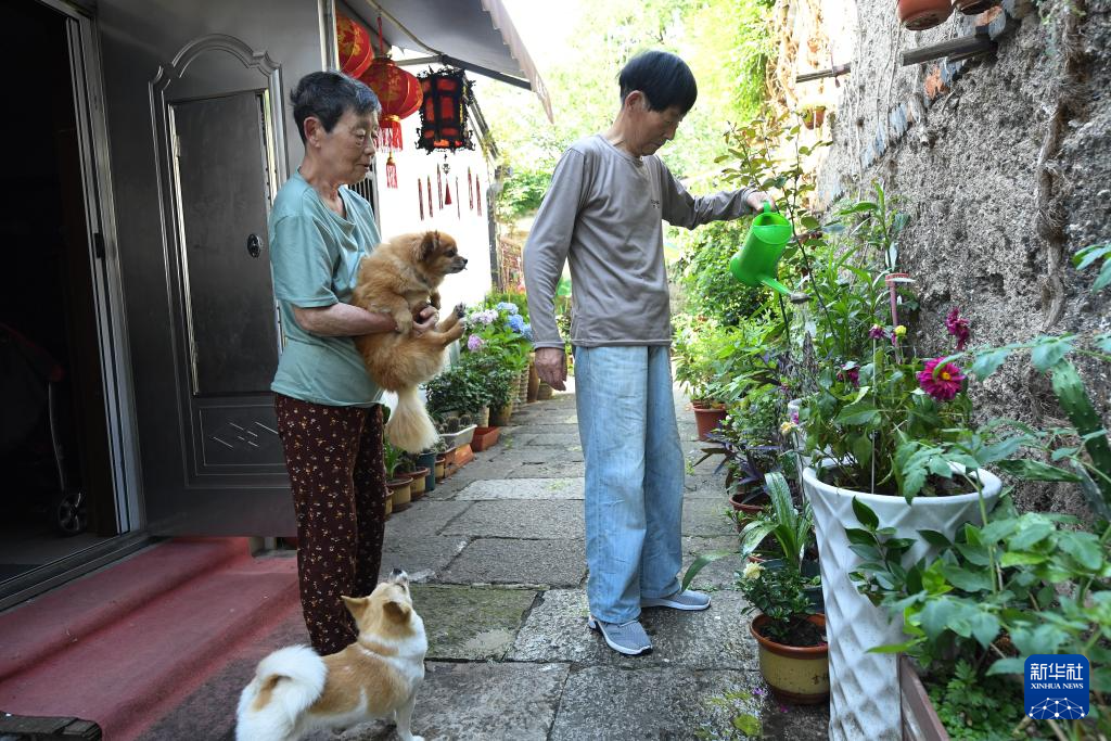 6月12日,在杭州桥西历史文化街区,市民程赞珍、陈莉影夫妇在自家门口浇花。