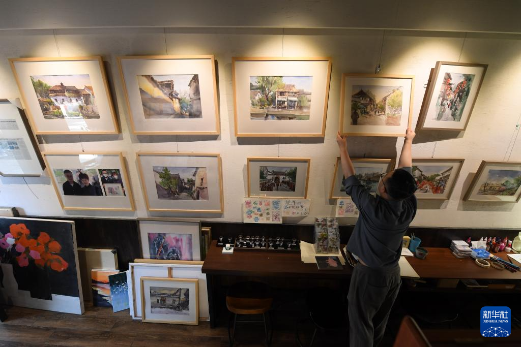 6月12日,杭州小河直街历史文化街区,青年画家张甜甜在工作室悬挂自己创作的运河主题的水彩画。