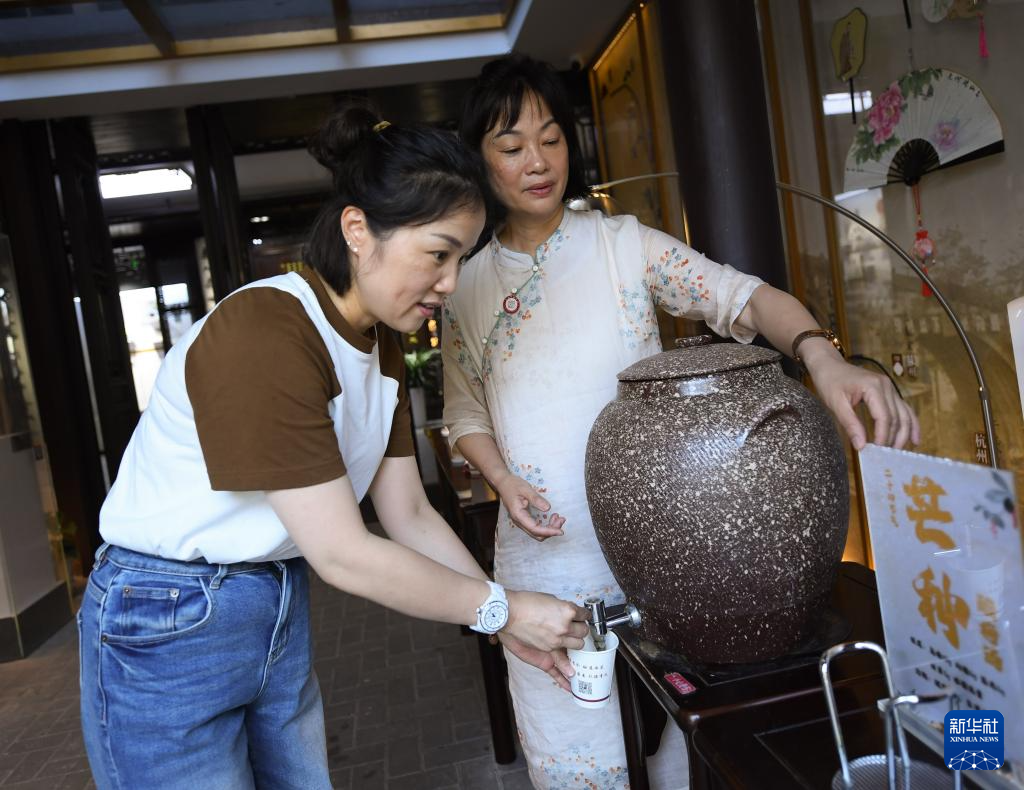 6月12日,在杭州桥西历史文化街区的大运河国医馆,游客体验芒种节气茶。