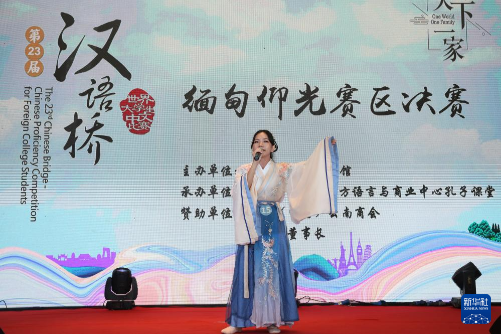 6月8日,在缅甸仰光,一名学生在“汉语桥”中文比赛仰光赛区比赛中展示才艺。