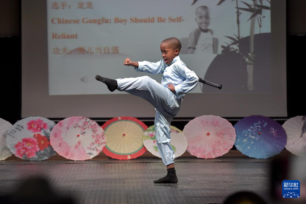 6月7日,一名选手在哈博罗内举行的“汉语桥”博茨瓦纳小学生中文秀比赛上表演中国功夫。