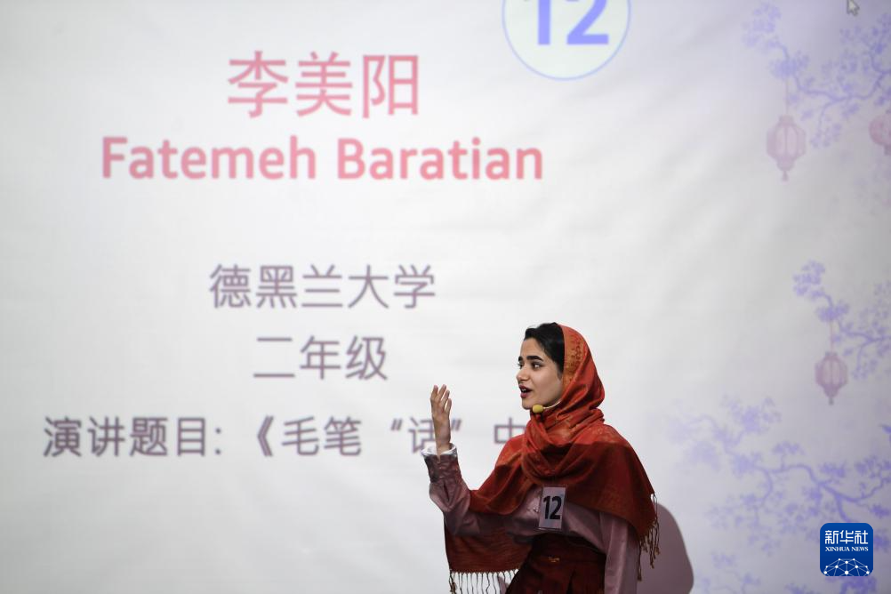 6月10日,在伊朗德黑兰举办的“汉语桥”世界大学生中文比赛伊朗赛区决赛上,一名选手参加演讲环节比赛。