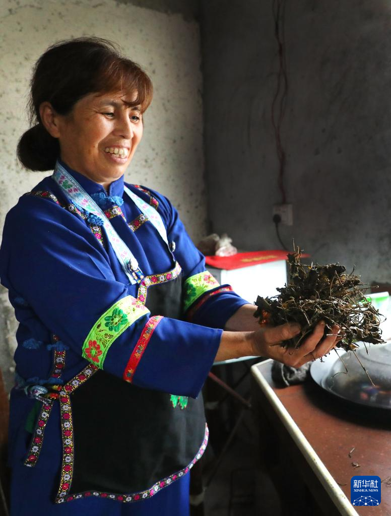在广西龙胜各族自治县伟江乡布弄村,村民蒙己秀展示用于打油茶的茶叶(6月26日摄)。